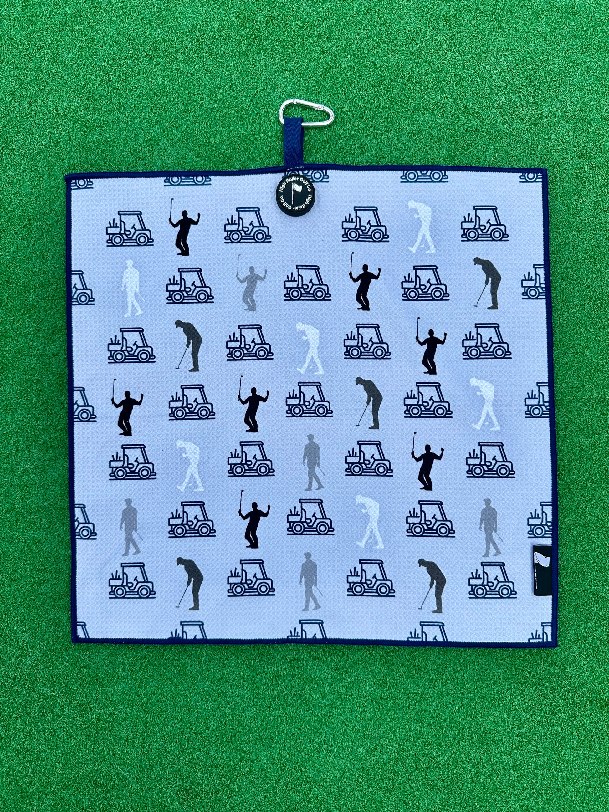 High Roller towels are designed to conveniently attach to any metal surface such as the side of your golf cart, golf bag, or even the flagpole on the green.
